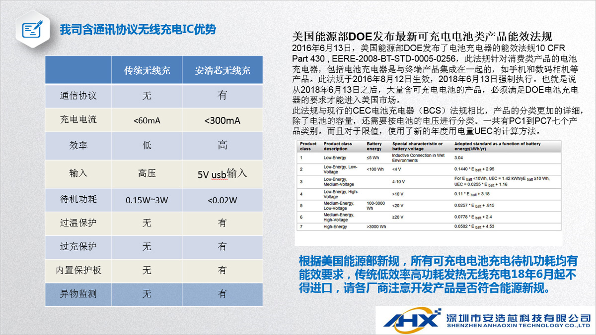 我司無線充電IC方案具有體高、成本優(yōu)勢(shì)明顯、應(yīng)用電路簡(jiǎn)單等特點(diǎn),發(fā)射和接收IC集成度高,帶有通訊協(xié)議,具有異物識(shí)別、過充保護(hù)、過放保護(hù)、短路保護(hù)等功能。